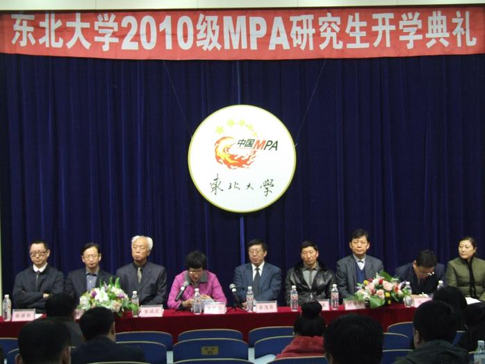2010级MPA研究生开学典礼在机电馆202室隆重举行。中共辽宁省委组织部干部教育处处长潘静华、辽宁省人力资源和社会保障厅公务员局培训处副处长郑兴家、日本三级