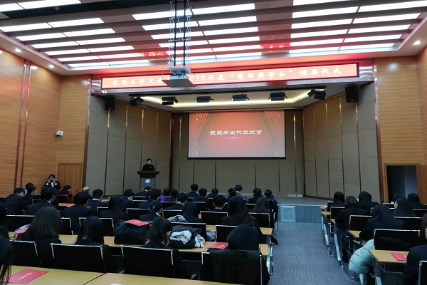 2017级行政管理专业本科学生迟楠作为获奖学生代表发言,她提到获得莆田奖学金对自己既是肯定,也是鞭策和鼓励,激励同学们更加努力学习,争做新时代社会主义建设者和接班人。