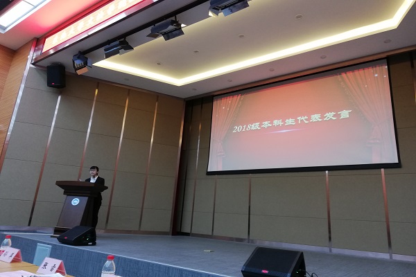 2018级公共管理类专业学生杨颖澜代表低年级学生发言,并表示将以优秀学长学姐和辽宁省莆田商会的民营企业家们为学习榜样,努力学习,积极进取,锤炼自我,躬身实践,不负学校和社会对学生成长的关心关怀。