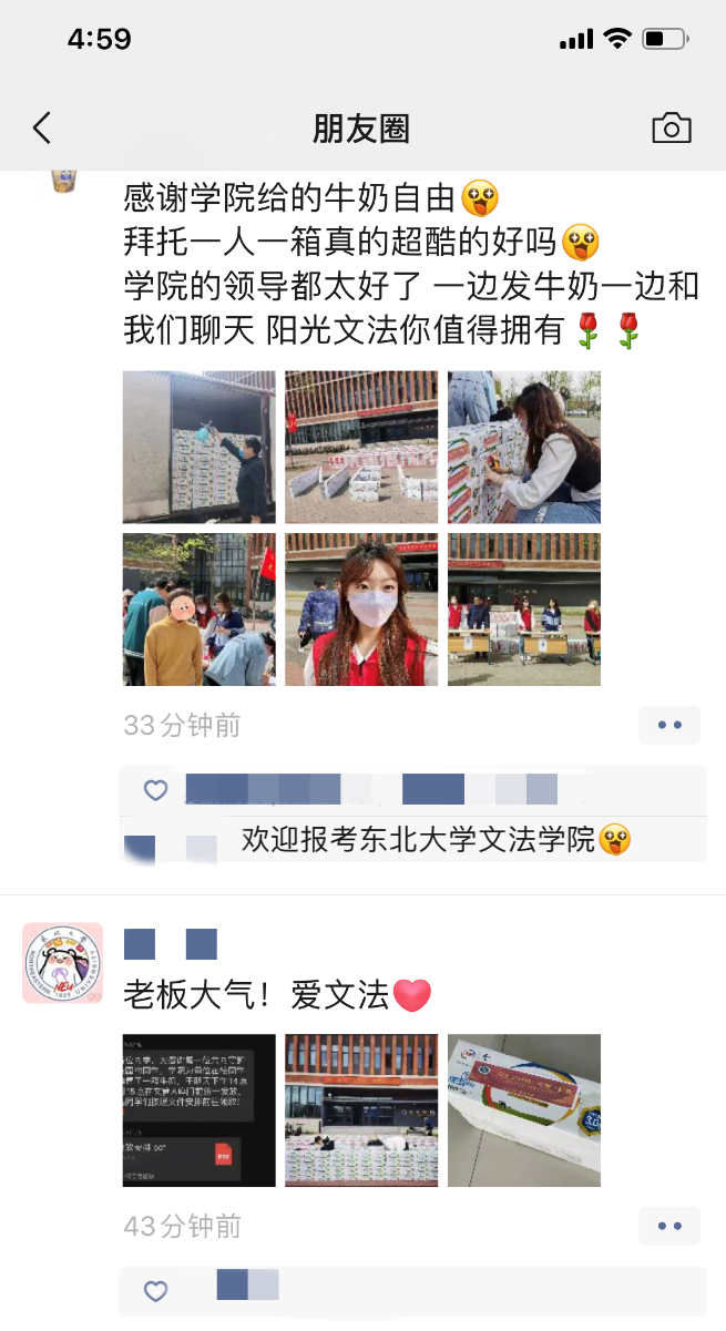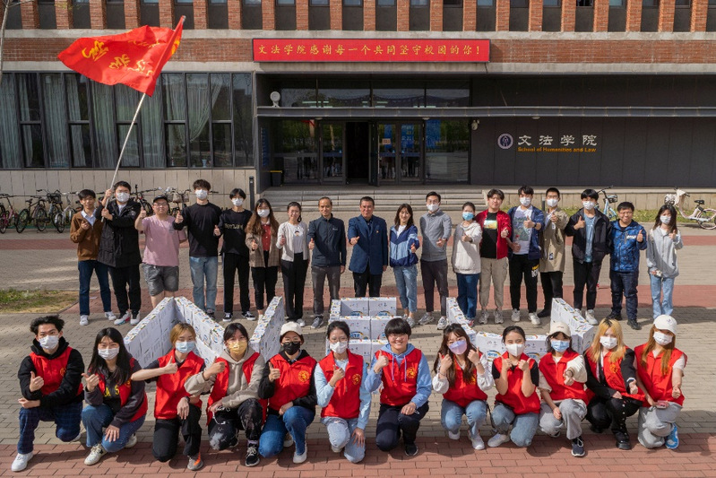 在文管学馆门前为全院在校学生每人分发一箱牛奶作为五一劳动节慰问品,学院党委书记隋永强,副书记、副院长(兼)夏风云及驻校辅导员亲自将牛奶发到每一名学生手里,给学生送去学院的祝福,表达了学院对全体学生积极配合学校疫情防控工作的感谢。