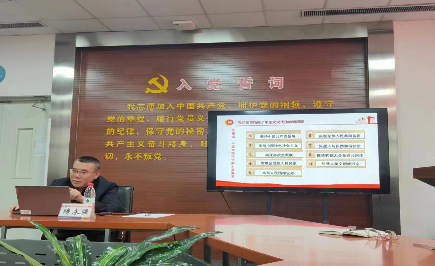 在报告伊始,隋永强回顾了中国近现代史,随后,结合历史事件,深入阐述了中国共产党在民族复兴进程中的重要作用和伟大贡献,强调了坚持中国共产党领导是中国特色社会主义最本质的特征。从党领导人民走中国式现代化是历史的必然;党的领导拓展了中国式现代化的新境界;走中国式现代化新道路必须把握坚持党的领导的着力点三个方面对中国式现代化进行了详细的阐述。