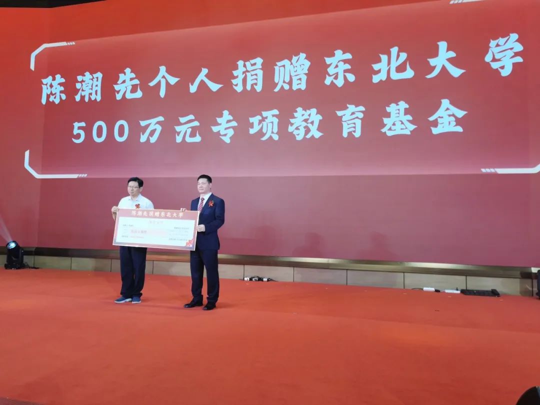 孙雷副校长在上市庆典仪式接受陈潮先校友给母校的捐赠支票。