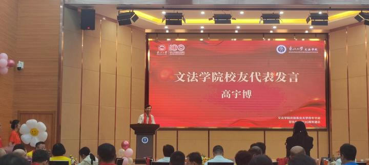 高宇博、王刚两位校友作为校友代表分别发言,表达了对母校百年校庆的祝福和母校培养的感恩之情,同时对学校学院发展寄予祝福和希冀。文硕2304班周志平作为在校生代表发言,表达了对校友们的敬意和对学院的感激,他表示所有在校生将努力学习,不负老师们的精心培养与学长学姐们的殷切期盼。