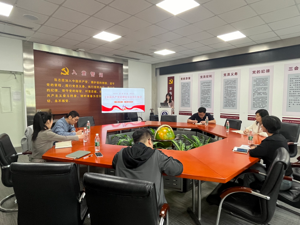 学生工作办公室党支部在浑南校区文管学馆A202会议室召开党纪学习教育专题会议,支部对接领导、学院副院长李丹,党委副书记、副院长严立宁参加会议,支部书记甘霖为支部成员讲授纪律党课。